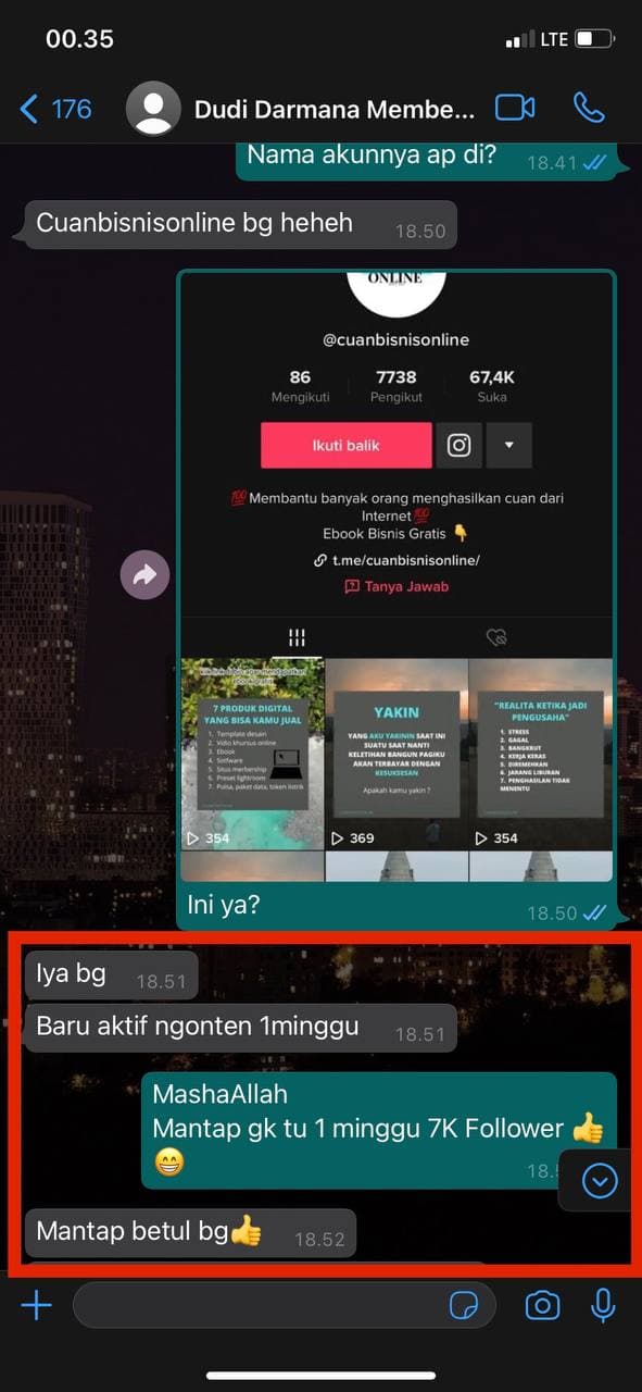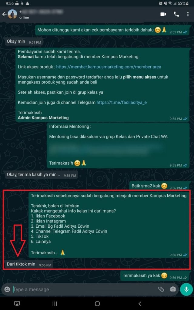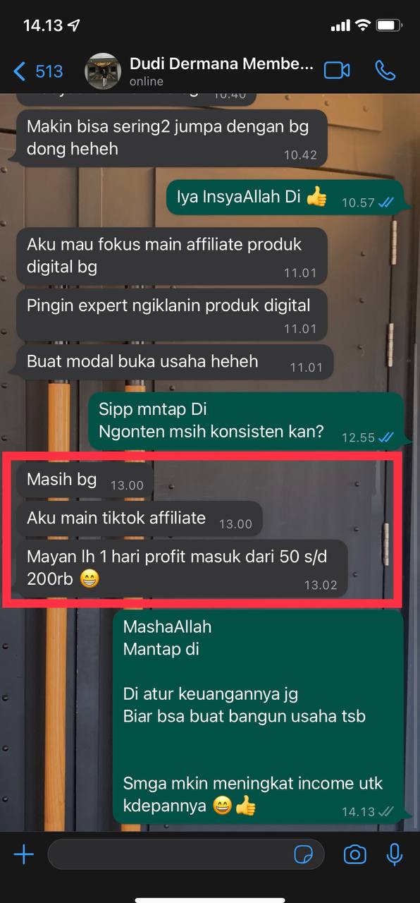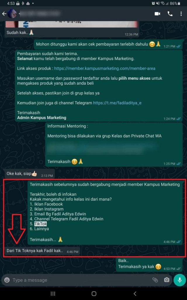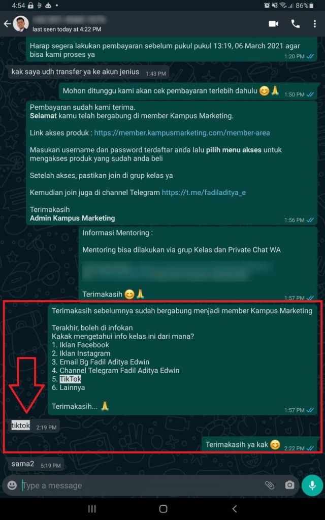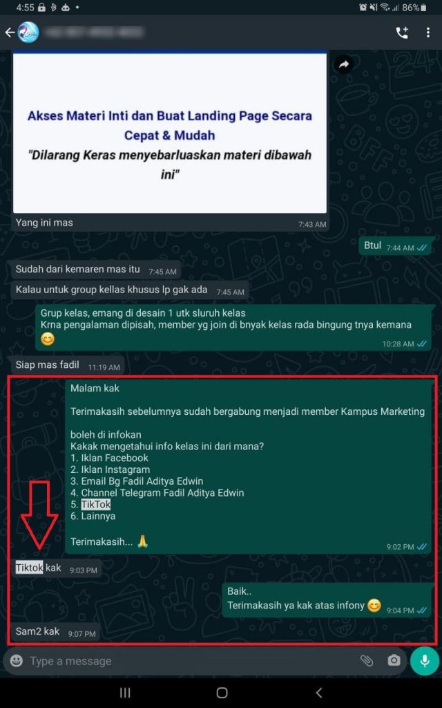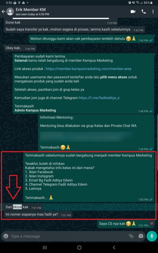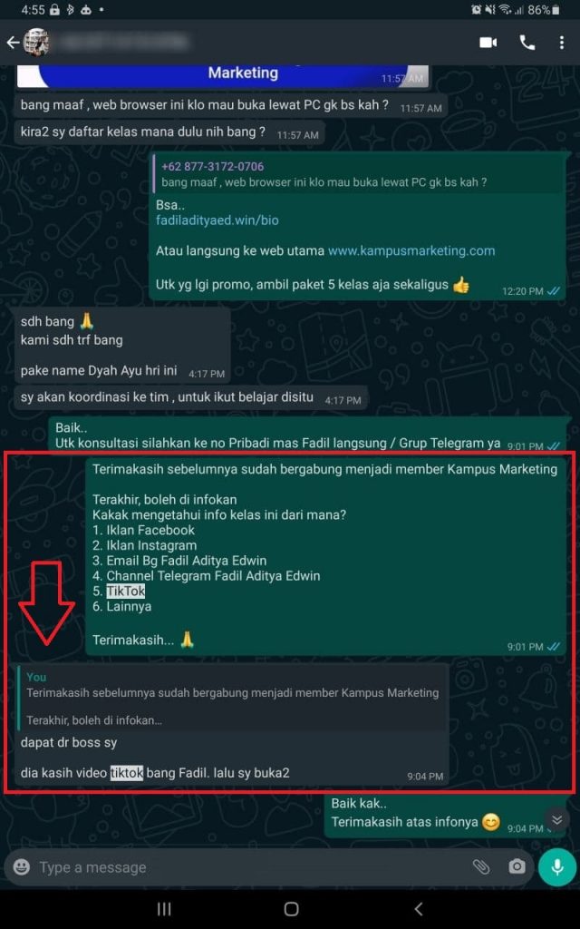 Kami tahu kendala setiap orang yang ingin belajar ialah sulit menghubungi mentor walaupun sudah punya grup, karenanya di Kampus Tiktok kami menyediakan ruang private chat di WA bagi Anda yang ingin konsultasi.