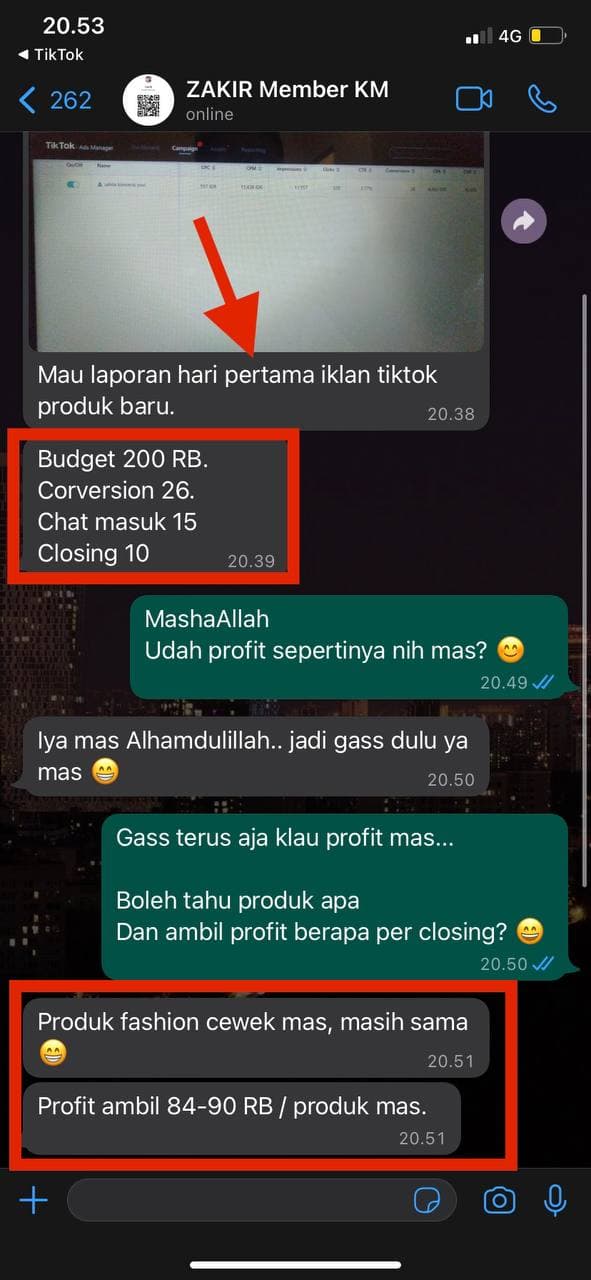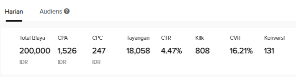 Screenshot di atas adalah salah satu hasil iklan saya yang memperoleh 131 konversi dengan budget 200rb saja (CPA Hanya Rp. 1.500), dimana profit per produk adalah 240rb. Masih ragu? cek testimoni member saya berikut