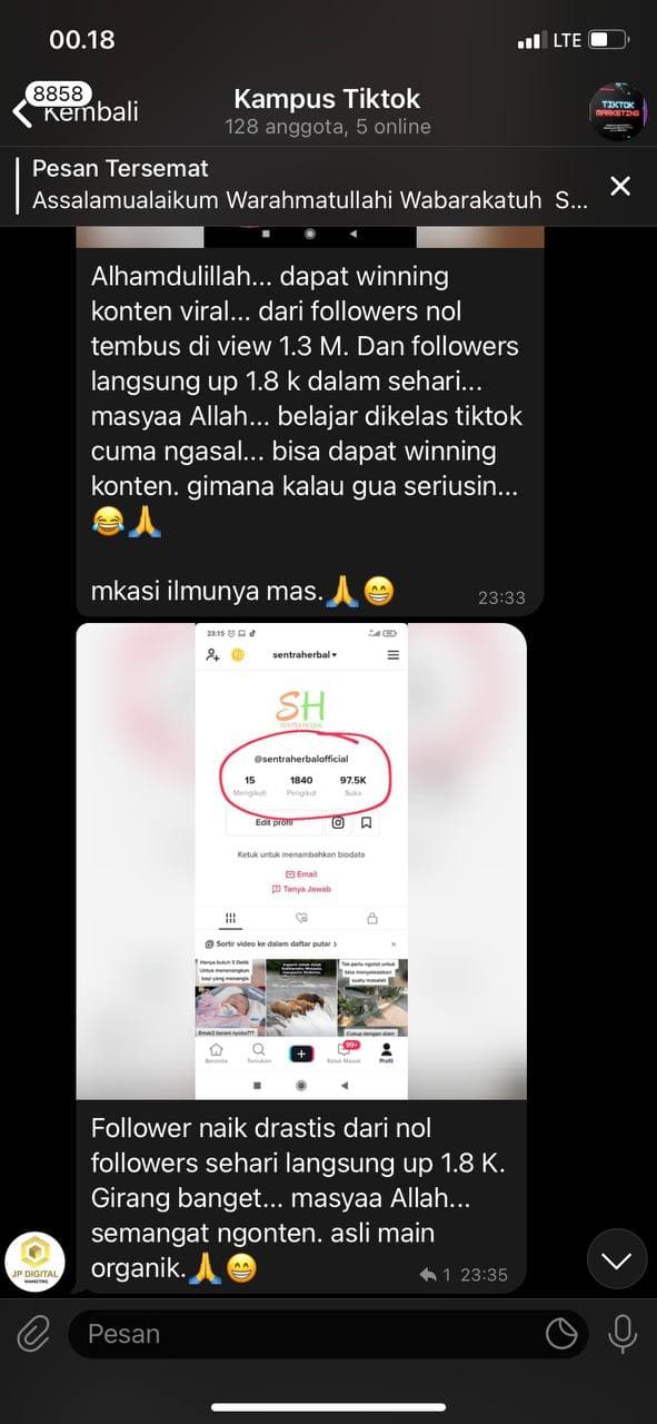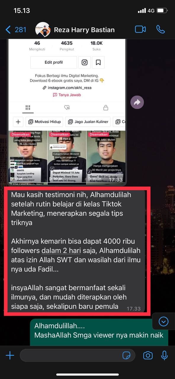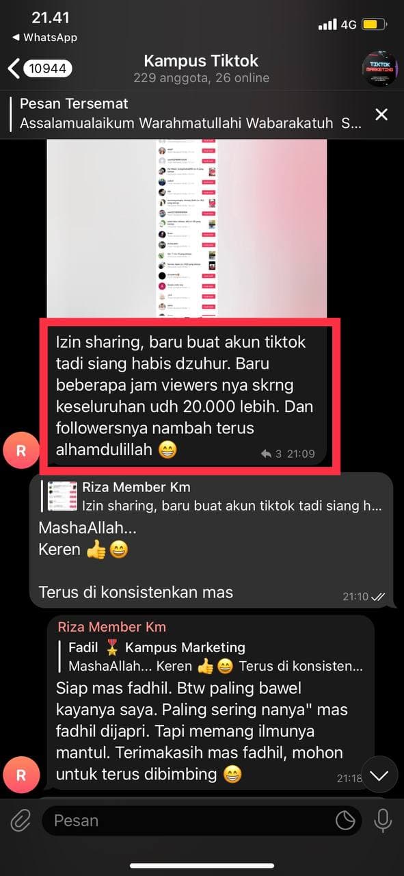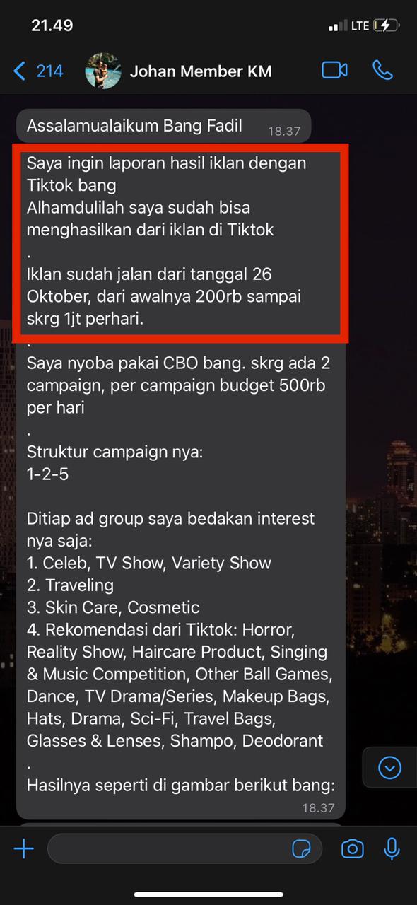 Ini adalah testimoni member saya dimana beliau memperoleh 19 Closing dengan budget 41rb doang (Profit bersih minimal 2,4 jt) Serta ada juga yang sudah mulai ngiklan dengan budget 1jt per hari, Tiktok Ads masih sangat simple dan murah !